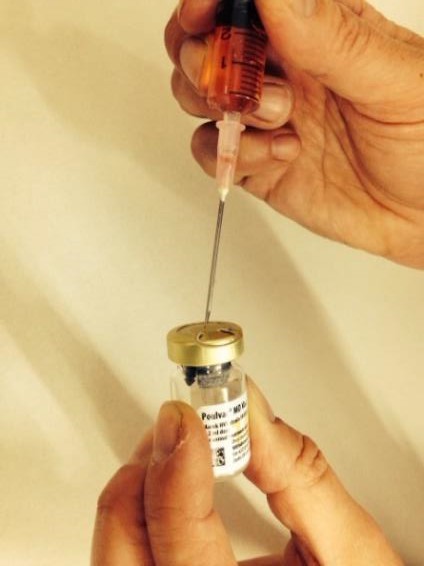 Each chick needs 0.2ml injecting subcutaneously or intramuscularly and here we explain the procedure: